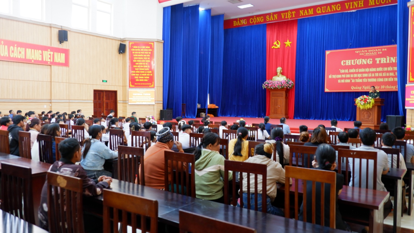 Thực hiện Chương trình “Cán bộ, chiến sĩ Quân đội nâng bước em đến trường” và mô hình “Áo trắng yêu thương cùng em đến trường”, Trung đoàn Pháo binh 4, Sư đoàn 10, Quân đoàn 34 đã tổ chức trao tặng quà cho các em học sinh có hoàn cảnh khó khăn tại xã Ia Tơi và xã Ia Đal, tỉnh Quảng Ngãi.