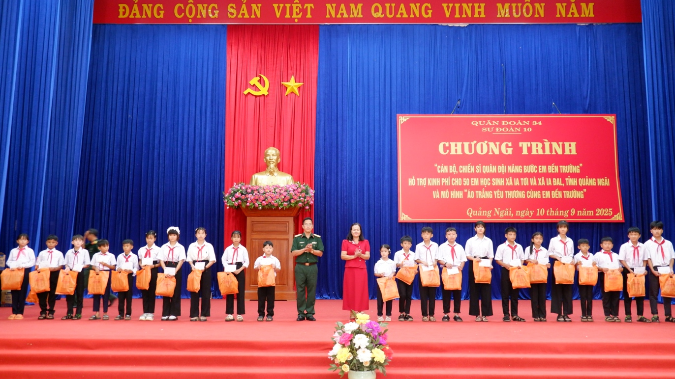 Theo đó, 50 em học sinh có hoàn cảnh khó khăn (31 em tại xã Ia Tơi, 19 em tại xã Ia Đal) được nhận phần quà trị giá 7,4 triệu đồng mỗi em, với tổng số tiền hỗ trợ 370 triệu đồng. Thực hiện mô hình “Áo trắng yêu thương cùng em đến trường”, Trung đoàn cũng trao tặng 50 bộ đồng phục học sinh cho các em, góp phần tiếp thêm niềm vui, sự tự tin trong năm học mới.